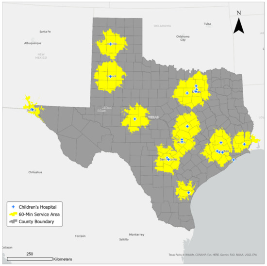 In relation to the above, a network service area was also adopted as an efficient technique to model geographic accessibility to the hospitals. Unlike the alternatives, mostly potential models, network service areas are widely regarded as a realistic and more meaningful method to measure and visualize accessibility [47,48]. A network service area is defined as “a region that encompasses all streets that can be accessed within a given distance or travel time from one or more facilities” [49]. We utilized Esri’s ArcGIS Online network analyst service to determine 60-min service areas around children’s hospitals. In other words, we determined areas within Texas where residents can readily physically reach a children’s hospital within sixty minutes of traveling by car.