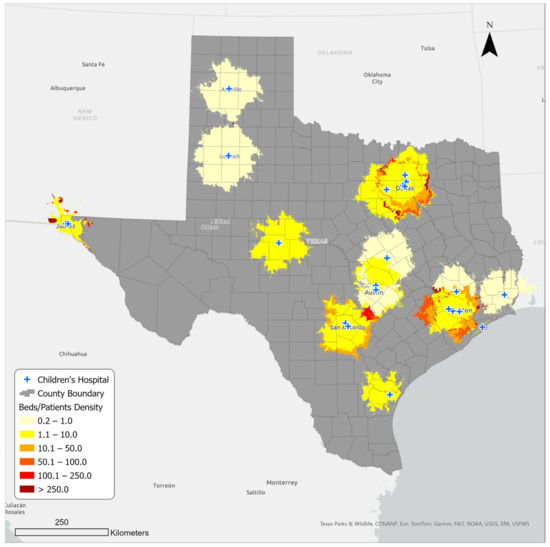 In 2015, there were about 30 million pediatric (18-year-olds and younger) emergency visits in the US, out of which 40% were children younger than five [1]. Respiratory and viral infections are among the most common reasons for emergency visits and can sometimes be time-sensitive and potentially life-threatening, especially for children under five [2]. Children’s physiology, anatomy, and medical needs are unique and differ from adults’, thus requiring special treatment and equipment. Meanwhile, many emergency departments do not have the proper equipment and specialized physicians to help pediatric patients [3,4]. A 2022 nationwide surge in cases of respiratory syncytial virus (RSV) highlighted this need for adequate pediatric hospital care, as many hospitals were pushed to capacity [5]. This problem impacted Texas, as more emergency room visits and hospital admissions led to pediatric hospital bed shortages across the state [6]. Although there was a higher volume of patients in urban areas, many Texas rural hospitals’ capacities were pushed to the limit while struggling with personnel shortages, particularly respiratory therapists [7].In addition to viral and infectious diseases, which require immediate access to a hospital with a pediatric emergency unit, chronic diseases such as childhood cancer and newborn complications do not require urgent access to an emergency room, but they do require frequent access to a hospital that provides specialized pediatric care [8]. In both situations, whether a disease requires urgent emergency care or frequent visits, geographic access to a hospital with emergency and specialized pediatric care can impact patients’ chances of receiving care in a timely manner. More generally, long travel distance to healthcare facilities (>60 min) has been identified as a major contributor to under-5 mortality and minimal healthcare utilization [9].