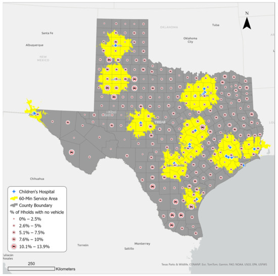 Finally, this study examined accessibility in terms of vehicle availability. Although most of the households in Texas have access to a vehicle, a considerable number of households—over half a million—do not. Out of this number, over 135,000 individuals live outside a sixty-minute service area from a children’s hospital, primarily in rural Texas. Some counties in the south, north, and west had a large number of households with no access to a vehicle, and they were also outside of the sixty-minute service area. Thus, children living in these counties were potentially at a higher health risk when emergency care was needed.