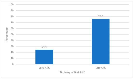 Three aspects of ANC are regarded as critical for maternal and child health services. These are the number of ANC visits, the availability of ANC by a skilled professional and the place of ANC services. Studies on the number of ANC visits have focused on the timing of first antenatal visits [11], adherence to the recommended minimum number of visits [8,12,13] and the quality of care. This study focused on the timing of the first antenatal visit. For this study, early initiation is regarded as a visit during the first trimester of the pregnancy, while late initiation is regarded as ANC visits initiated after the first trimester. Early initiation of ANC means the timely provision of maternal health information and services according to the gestational age and health condition, including iron supplementation, deworming tablets, tetanus injections and malaria prophylaxis (4). On the other hand, late ANC initiation means that pregnant women miss the opportunity to receive health information and interventions, such as the early detection of HIV, malaria and anemia prophylaxis, and prevention or management of complications.