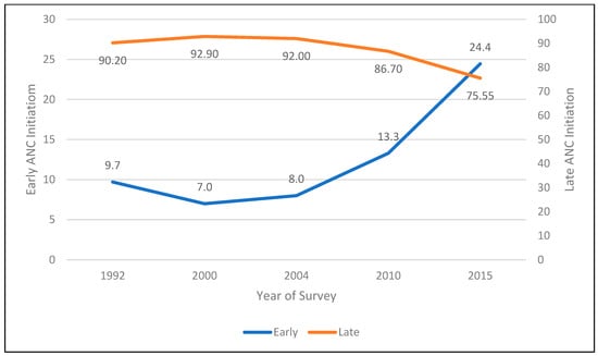 The main finding of this study was the persistently late ANC initiation in Malawi. The data analysis revealed that the prevalence of late ANC initiation is 75.5%. Similar percentages from earlier MDHSs are 90.2% in 1992, 92.9% in 2000, 92.0% in 2004 and 87.6% in 2010 [2,3,4,5]. Figure 3 indicates that even though late initiation of ANC is declining, the percentage of women initiating ANC late is still very high.