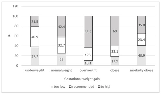 As presented in Table 2, only 30.7% of the mothers gained weight during gestation as recommended by the IOM, but more than 47% experienced a too-high GWG. Figure 1 presents the GWG categories according to prepregnancy weight status. As shown, the GWG categories differed highly significantly (<0.001) between the weight status categories. While more than 40% of underweight women showed a recommended GWG and only 21.5% of underweight women experienced a too-high GWG, more than 63% of overweight women gained too much weight, and only 26.8% of overweight women showed a GWG corresponding to the IOM recommendation. A similar pattern was found for women in obese grades 1 and 2. Among morbidly obese women, however, more than 40% gained less than the recommended weight, and only 35.8% experienced a too-high GWG.