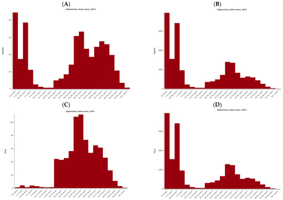 While previous studies primarily focused on global or regional air pollution-related health effects, limited attention has been paid to comprehensively assessing the burden of disease in specific countries arising from air pollution. In the case of Afghanistan, a country navigating the challenges of post-conflict recovery and rapid urbanization, the health effects of air pollution emerge as a critical concern [11]. Afghanistan ranks prominently among the most air-polluted nations globally, with elevated concentrations of PM and other air pollutants posing significant environmental and public health challenges. In 2019, Afghanistan held the fourth position globally in the Air Quality Index (AQI) assessment of PM2.5 levels, indicating a notable standing among countries experiencing elevated pollution levels. This ranking positioned Afghanistan just behind Mongolia, Pakistan, and Bangladesh [12]. Exposure patterns in Afghanistan vary between outdoor and indoor sources. Urban areas with a high population density and increased industrialization experience elevated ambient air pollution, while rural areas, which rely on traditional cooking methods, contribute to indoor pollution that particularly affects vulnerable populations like women and children [13,14,15]. This analysis aims to shed light on the specific health effects experienced by the Afghan population due to exposure to air pollution. Understanding air pollution-related health impacts in Afghanistan is crucial for developing targeted interventions that align with the nation’s specific challenges and needs. To achieve this objective, recent data from the Global Burden of Disease (GBD) Study 2019 obtained from the Institute for Health Metrics and Evaluation were analyzed. Specific metrics (i.e., disability-adjusted life-years (DALYs), years of life lost (YLLs), years lived with disability (YLDs), and deaths) attributed to air pollution in Afghanistan were taken into consideration to characterize the burden of disease due to air pollution in Afghanistan.