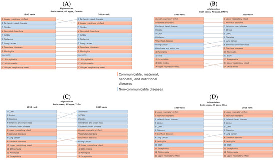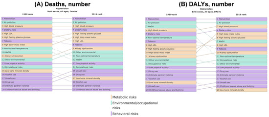 The most important risks for numbers of deaths (A), disability-adjusted life-years (DALYs) (B), years lived with disability (YLDs) (C), and years of life lost (YLLs) (D) in Afghanistan comparing the years 1990 and 2019.