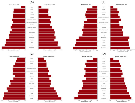 Percentages of deaths (A), disability-adjusted life-years (DALYs) (B), years lived with disability (YLDs) (C), and years of life lost (YLLs) (D) attributed to air pollution for males and females in selected countries for the year 2019.