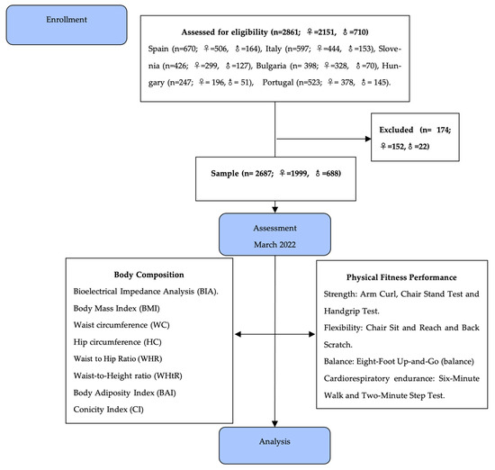 The recruitment of participants was carried out in compliance with the Declaration of Helsinki and was approved by the Ethics Committee of the Polytechnic Institute of Viana do Castelo (IPVC-ESDL180417). Informed consent was obtained from all participants. Inclusion criteria were as follows: age between 59 and 90 years and participation in the In Common Sport Plus Project in the years 2021–2023. Exclusion criteria included any functional or pathological limitations that would impede the normal development of any of the proposed tests. In this study, 2687 active European older adults participated (Spain, Italy, Slovenia, Bulgaria, Hungary, and Portugal), 1999 of whom were women and 688 of whom were men, with an average age of 70.05 ± 5.5 years (Figure 1). We defined active older adults as all those who met the recommendations of the American College of Sports Medicine regarding physical exercise [26,27]. Data were collected and analysed in a way that prevents the direct identification of participants, due to data coding.