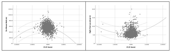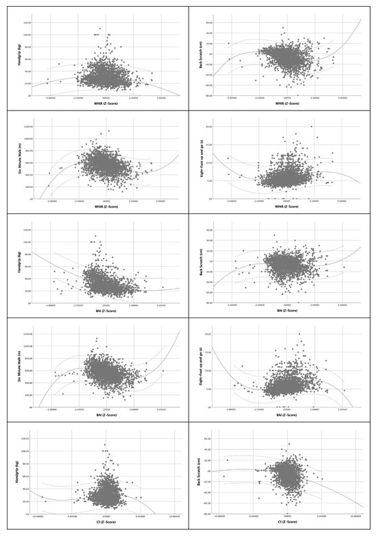 Figure 2 visualises the association of physical fitness performance with anthropometric indices according to the z-score of BMI, WHR, WHtR, BAI, and CI using Lowess fit plots. In these plots, we can observe how strength levels tend to decrease as WHR, WHtR, and CI values increase. However, the opposite occurs when analysing BMI. If we examine cardiorespiratory endurance and flexibility, we can note that they exhibit a similar behaviour, as their values increase simultaneously with BMI, WHtR, and BAI, and tend to decrease when WHR and CI values increase. Notably, flexibility shows a drastic decrease with an increase in WHR. Finally, regarding dynamic balance, we observe that its behaviour is different from the other variables, as it remains relatively constant with small oscillations with higher BMI and WHR, increases with higher CI, and decreases with higher WHtR and BAI.