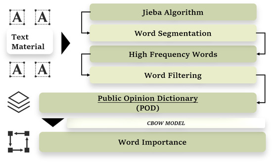 Subsequently, based on the flow chart in Figure 1, we first utilized Jieba [27], one popular algorithm for Chinese natural language processing (NLP), to segment the Chinese text materials. We retained only nouns and adjectives with Chinese character counts greater than or equal to 2. We removed meaningless words and retained words with high frequencies. Then, we used the CBOW model proposed by [28], to calculate the importance of each word, whose details were shown in (Supplementary Method S1, Table S2).