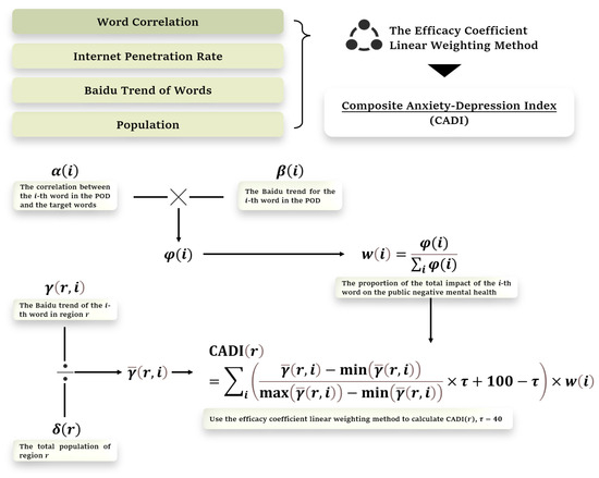 Figure 2 depicts the pathway for constructing the Composite Anxiety and Depression Index. Let the correlation result computed by the CBOW model between the -th word in the POD and its target words be . Let be the yearly averaged Baidu trend for the -th word in the -th year. We then adjusted using the correlation of the -th word as,