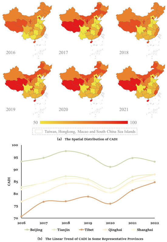 Last, we compute the CADI for each region in each year. Let be the CADI of region in the -th year. We use the efficacy coefficient linear weighting method [29] to calculate ,