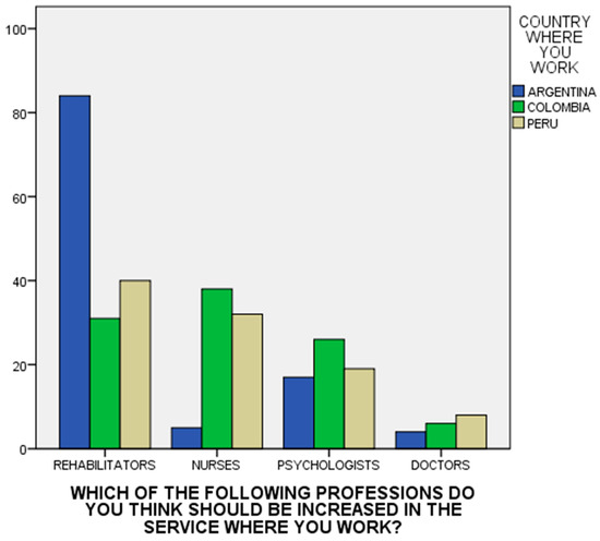 Regarding the seventh question, investigating which professionals the individual thinks should be increased in the service where they work, the participants suggested increasing the number of nurses and rehabilitators (χ2 = 57.042; df = 6; p < 0.0001) (see Figure 1). The assessment tool was reliable when measured with the Cronbach’s alpha: Argentina = 0.759 (95% CI: 0.68–0.82); Colombia= 0.748 (0.66–0.81); and Peru = 0.73 (0.64–0.80).