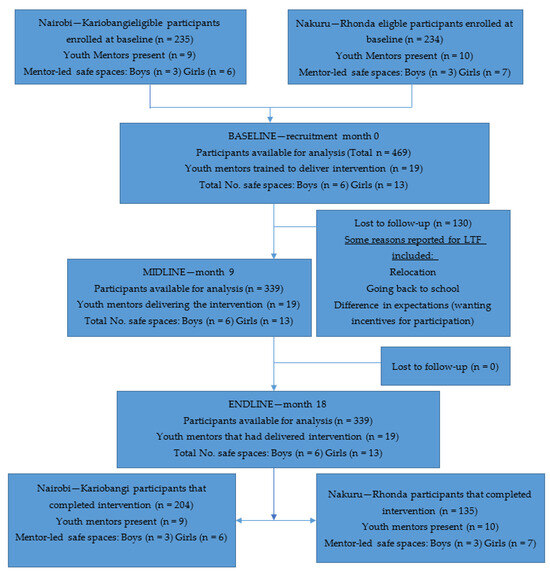 The targeted sample size for this study was 400 adolescents equally split across the two sites. A total of 469 adolescents were enrolled for the baseline survey to account for potential loss to follow-up, while also keeping in mind the uncertainty brought about by the pandemic. Adolescents recruited into the study were out of school, between the ages of 15 and 18 years, residing within the two identified urban informal settlements, and did not demonstrate any severe mental disorder or disability that would prevent meaningful group participation. During recruitment, participants were screened for depression using the Patient Health Questionnaire-9 (PHQ-9) and for substance use using the World Health Organization (WHO) Alcohol, Smoking and Substance Involvement Screening Tool version 3 (ASSIST v.3). Those scoring high in severe mental distress, alcohol and substance use, and suicidal tendencies were referred to relevant psychiatric or psychological services.