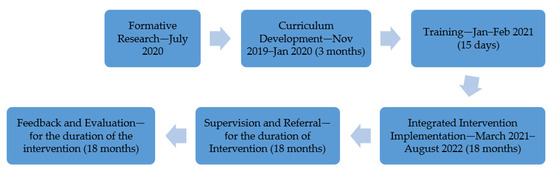 Our study, Bridging the Gaps (BTG), was a unique attempt to evaluate the feasibility of integrating a mental health component into an evidence-based, mentor-led, social, health, and economic-empowerment program for urban, informal-settlement-dwelling, out-of-school adolescents in Kenya. The team anticipated the challenge of interrelating the dynamic factors affecting the identified population given the fact that they are Not in Employment, Education, or Training (NEET), and their possible emancipated status [11]. The Holistic Framework proposed by McElroy [12,13,14] guided the team in an attempt to successfully tackle barriers to improved well-being through its multidimensional approach while employing fidelity checks to ensure adequate integration of the adapted curricula. The program uses a task-sharing model that has been widely tested in sub-Saharan Africa (SSA), and has been promoted as a successful implementation strategy for scaling up mental health to improve outcomes in low- and middle-income countries (LMICs) [15,16,17,18]. The aim of this article is to document the processes around the design and implementation of this innovative intervention and present a summary of lessons learned.