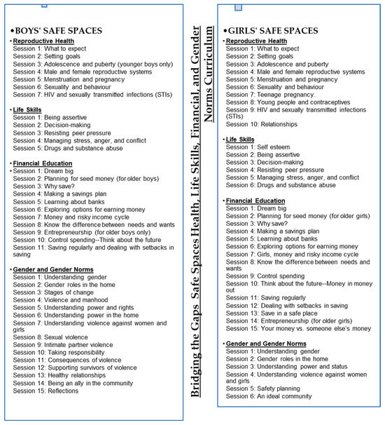 Bridging the Gaps (BTG) safe space health, life, financial, and gender norms curricula adaptation session outline.