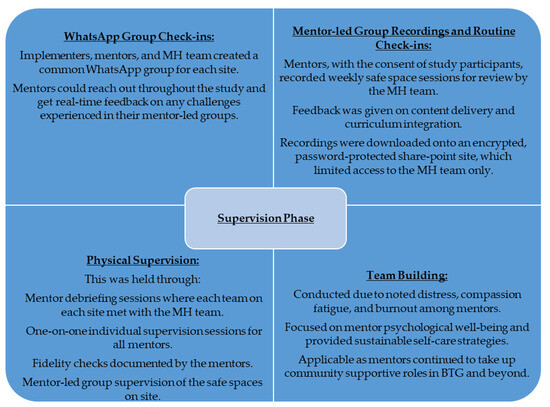 Supervision focused on the mental health component of the intervention since this was a new component for the mentors, ensuring that the quality and fidelity of the PM+ were maintained. The mental health team kept track of mentor skills, provided guidance on complex cases raised for management, gave timely feedback, assessed adolescents’ improvement in the course of the intervention, and sustained mentorship for proper adaptation of the curriculum. Innovative approaches to supervision, including WhatsApp group creation and real-time communication with mentors, listening to group recordings, and the physical observation of sessions were considered and implemented given the COVID-19 context, as discussed in Figure 6.