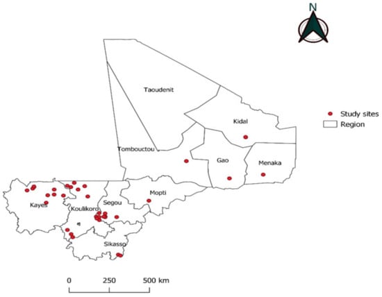 Location of the study sites in the nine administrative regions of Mali where malaria is endemic.