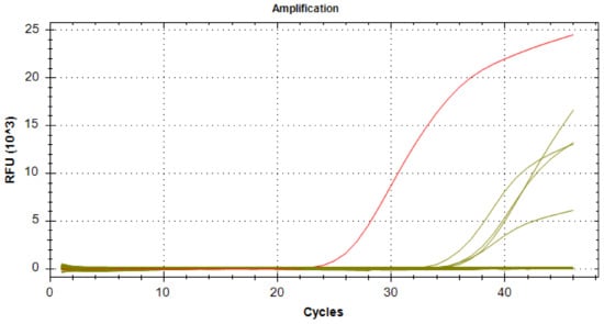 Amplification curves for real-time PCR targeting 18S rRNA of Plasmodium vivax species in Menaka (positive control in red and positive samples in green).