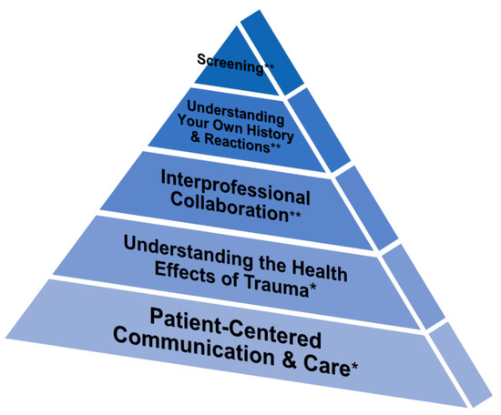- Gundacker, C.; Barry, C.; Laurent, E.; Sieracki, R.A. Scoping Review of Trauma-Informed Curricula for Primary Care Providers. Fam. Med. 2021, 53, 843–856. [Google Scholar] [CrossRef] [PubMed]