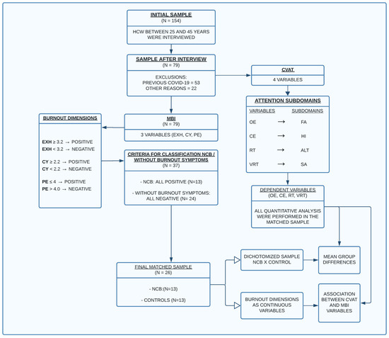 We provided a comprehensive description of all elements involved in this study, following the guidelines proposed by the ©STROBE initiative [59]. After applying exclusion and inclusion criteria (interview), the selected participants filled out the MBI. Then, participants were divided into two groups based on their scores across the inventory’s three dimensions: controls and those exhibiting significant burnout symptoms, the latter group hereafter referred to as the non-clinical burnout (NCB) group. Finally, they performed the continuous visual attention test (CVAT). The researchers who administered the CVAT were blinded to the participants’ burnout symptoms. All quantitative analyses were performed using the matched groups.