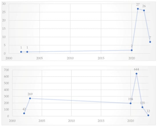 There is consensus in the literature regarding the fact that COVID-19 has had different impacts on people’s lives, particularly with regard to quality of life, as a result of the different restrictions imposed on social activities. Furthermore, this phenomenon also profoundly changed work dynamics, forcing workers to adapt to a new work context, which was a trigger for cases of health disorders, particularly emotional, psychological, and mental. In this sense, the period during and after the pandemic has been the focus of study regarding the prolonged effects of confinement and teleworking on health [91]. The items analyzed make it clear that, from 2020 onwards, there was a significant increase in scientific production in this area, with 2021 being the year in which there was a greater number of publications.