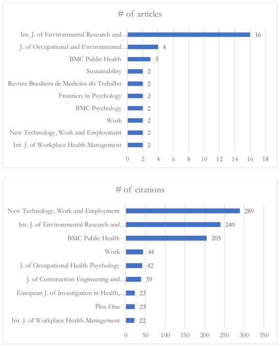 Figure 3 shows the ten journals with the highest number of publications, as well as the number of citations. Those with three or more articles are: the International Journal of Environmental Research and Public Health (16 articles), Journal of Occupational and Environmental Medicine (4 articles), and BMC Public Health (3 articles). The journals with the most citations are: New Technology, Work and Employment (289 citations), Journal of Occupational and Environmental Medicine (241 citations), International Journal of Environmental Research and Public Health (240 citations), and BMC Public Health (205 citations).