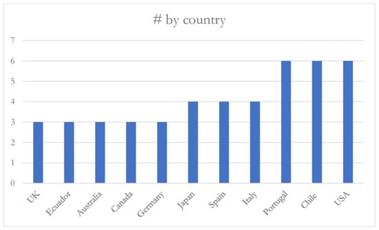 Regarding the geographical distribution of these publications, Figure 4 shows where 70.03% of the articles were published. The remaining publications are geographically dispersed: France, Sweden, Colombia, and Brazil, with two articles each, and Mexico, the Netherlands, Argentina, Latvia, South Korea, Lithuania, Poland, Oman, Indonesia, Malaysia, and Turkey with one article each.