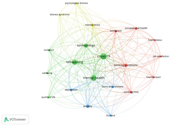 Cluster 3, in blue, encompasses the keywords anxiety, burnout, depression, and work environment, highlighting the psychological disorders generated by remote work.