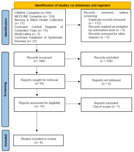 A total of 460 papers were identified for screening. After eliminating duplicates, 348 titles and abstracts were screened for eligibility, excluding 112 papers. Following an abstract review of 42 articles, ten articles underwent a full-text review, and nine met the eligibility criteria. The flowchart illustrating the screening process is presented in Figure 1.