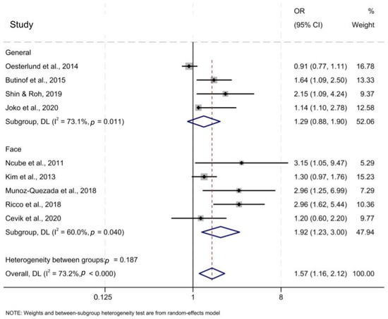 Figure 2 demonstrates the association between inadequate face or general PPE and OR of having APP symptoms. The bold line at OR = 1 indicates the odds ratio at which inadequate and adequate PPE use have the same odds of APP. Left of the bold line where OR < 1 is where inadequate PPE is associated with lower odds of APP than adequate PPE. Right of the bold line where OR > 1 is where inadequate PPE is associated with higher odds of APP than adequate PPE. ORs reported by individual studies appear as lines and are analyzed into subgroups. Subgroups and overall effect appear as diamonds. The pooled OR of overall inadequate PPE, encompassing both the general and face protection subgroups, was 1.57 (95% CI 1.16–2.12) compared to the reference group of workers using adequate or complete PPE. This suggests that inadequate PPE use is associated with increased odds of APP. There is slight variation in OR depending on PPE type. Inadequate general protection had OR = 1.29 (95% CI 0.88–1.90) and inadequate facial protection had OR = 1.92 (95% CI 1.39–1.89). These ORs suggest that not wearing face protection could be associated with higher odds of APP than not wearing general protection, although Cochran’s Q test indicated that the difference is not statistically significant.