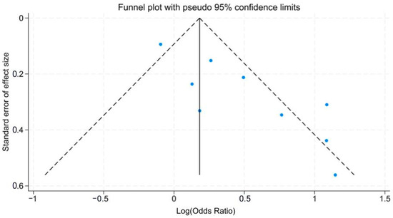 Begg’s funnel plot (Figure 3) indicates that the studies are scattered asymmetrically, with six studies having an overall effect that is more positive and only two studies having an overall effect that is more negative. This may suggest that studies showing that inadequate PPE is more strongly associated with APP are more likely to be published than studies that do not have significant or negative findings [61]. The higher OR for the face group demonstrates the importance of mask and eye protective measures to worker health. The similarity between the general and face subgroups indicates that comprehensive full-body PPE is essential because pesticides are potent and have multiple routes of exposure. Lacking face protection like masks, eye or head protection may put users at increased odds of APP because of susceptibility to various routes of exposure are heightened around the face and respiratory area, including dermal contact and inhalation [13]. Meanwhile, body protection like gloves and clothing can protect parts of the body that experience high pesticide dermal deposition and reduce transfer to the vulnerable face areas.