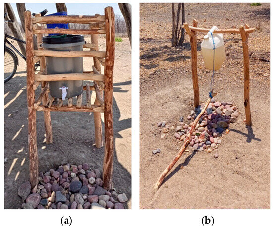 A handwashing facility observed in a village where Wash’Em was implemented. To the left (a) is one of the Veronica buckets that were distributed to 25 households in each village. On the right (b) is a Tippy Tap, constructed by another household in the same village after implementation of the Wash’Em designed handwashing behaviour change activities.