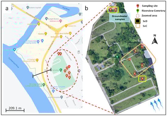 Soil sample locations. (a) Cemetery in Middle Tennessee is highlighted in green; both the Cumberland River and the Red River are nearby. Soils were sampled from 6–8′ (72–96” or 183−244 cm) adjacent to or right below the buried caskets, below the B horizon, and closer to the water table. (b) Soil sampling sites of the cemetery (zoomed area) and their respective soil series (Web Soil Survey). Blue arrows indicate the direction of the water flow. SeC: Sengtown gravelly silt loam, 5 to 12 percent slopes. SeD: Sengtown gravelly silt loam, 12 to 20 percent slopes. Sengtown series (USDA): https://soilseries.sc.egov.usda.gov/OSD_Docs/S/SENGTOWN.html (accessed on 1 January 2024).