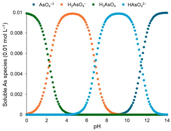 The solubility of arsenate species varies with pH. At low pH (<4), acidic forms like arsenous acid (H3AsO4) and dihydrogen arsenate (H2AsO4−) are dominant, with low solubility. Near neutral pH (7), hydrogen arsenate (HAsO42−) prevails, showing higher solubility. In highly alkaline conditions (>9), arsenate ions (AsO43−) predominate, generally with increased solubility. The figure was generated using data output from Visual MINTEQ software, simulating an As(V) concentration of 0.01 M.