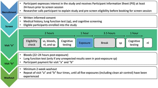 Participant exposures will be conducted at the Manchester Aerosol Chamber (MAC) facility. The MAC facility is part of the ATMO-ACCESS atmospheric simulation chamber network. It is an 18 m3 fluorinated ethylene propylene Teflon bag housed in a temperature- and humidity-controlled enclosure and illuminated by a combination of wavelength-filtered arc and halogen lamps. Clean inlet air is ensured by scrubbing with a series of filters and conditioners. Particle and gas levels are controlled either by injection of individual components or by coupling to a variety of real pollutant sources [49]. This facility as well as the techniques and specific instruments employed here have been used in many previous chamber studies [50,51,52]. For each pollutant mixture, a full characterisation will be conducted to identify the exact chamber conditions and experimental setpoints to achieve target pollutant concentrations to within acceptable limit. All experimental setpoints are computer-controlled and continuously monitored, ensuring participant safety, and enabling repeatability.