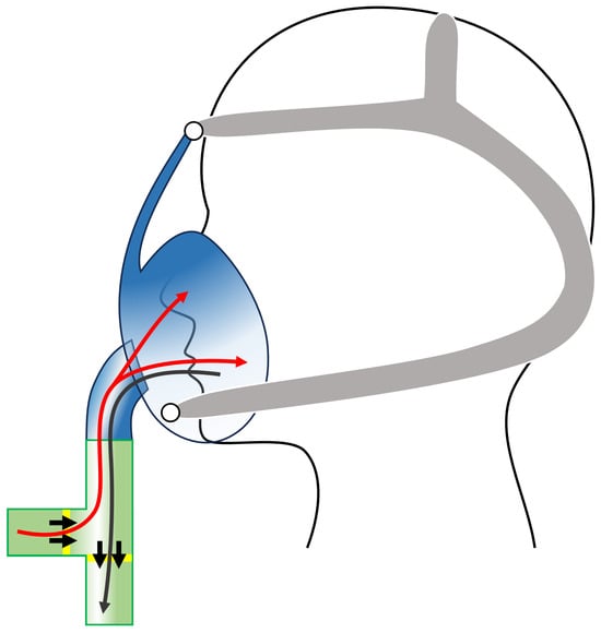 The two-way valve and mask set-up during exposure. Black arrows show airflow direction of one-way valves. Participants inhale air from the chamber (red line) and exhale into the surrounding room (dark grey line).