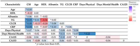 This figure displays Pearson correlation of continuous variables. The correlation coefficients between various health characteristics and CS, including age, HDL, albumin, triglycerides (TG), creatinine clearance rate (CLCR), C-reactive protein (CRP), days of physical activity, and cancer antigens (CA125 and CA153). Notable correlations include a positive association between CSI risk and factors like TG, CRP, and CLCR, while there is a negative correlation with HDL.