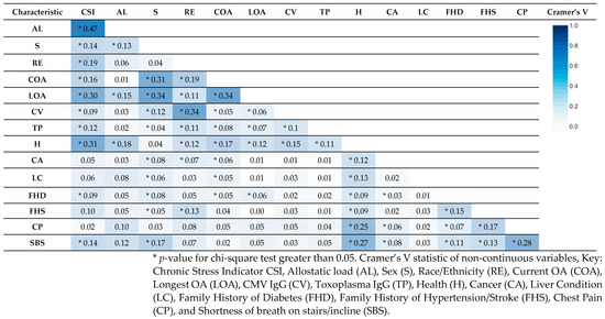 Figure 2 shows Cramer’s V statistic computed for categorical data. We see the strongest association between the CSI and AL of 0.47 which is expected considering they share some biomarkers for their construction. The next two strongest associations with CSI exist between Health abbreviated as ‘H’ (0.31) and LOA (0.30). We also see an association of 0.34 between LOA and COA.