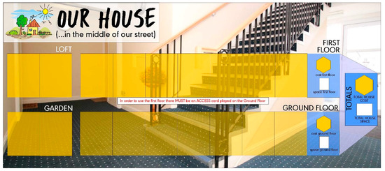 ‘Our House’ is played in person, with people in groups of between 6–35. Although it can be played solo, players are usually grouped into pairs to encourage discussion and reflection on the decisions being made. The game provides players with a player mat (Figure 1) representing a house; a deck of cards representing rooms within a house; and a set of adaptation tokens that can be used to adapt houses.