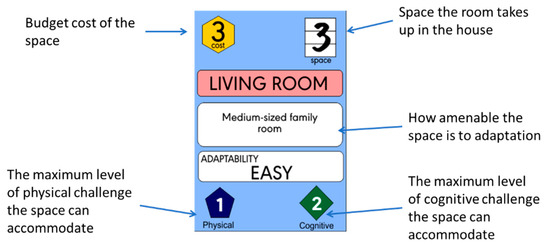 Each room card is labelled with an evidence-based budget cost, a score for physical accessibility, a score for cognitive accessibility, and an ‘ease of adaptation’ level (Figure 3) potentially providing insight to the longer-term capability of the room to support ageing in place.