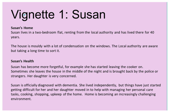 There was also evidence of impact on professional perspectives, where the storification and game narrative allowed a paradigm shift in thinking about what is best for supporting individuals’ cognitive and physical changes. In one example, participants looking after the vignette ‘Susan’ (Figure 4) from a policing background, were very concerned around safety and were negotiating the safety elements of house location, adaptations, and technology. They noted that if looking at this from their police officer perspective, usual practice would mean that Susan would have to move for the safety of her and others. However, the serious game challenged their perspective on the solution for support when taking it from a personal perspective: