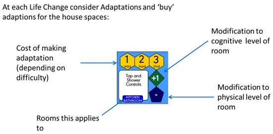 In the next turn of the game, players are then given an update on their vignette. This introduces a challenge (perhaps a health condition, accident, or other event) which increases the level of physical and/or cognitive need that a house must support. Players compare the revised need levels of the resident(s) to the accessibility of each room in the house and identify areas of the house that no longer support the needs of their resident(s). Next, an assortment of potential home adaptations is presented, which (for a cost) can increase the physical and/or cognitive accessibility of a room or house (Figure 5).
