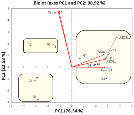 Furthermore, nine variables (group IDs: CRa-226, CTh-232, CK-40, D, AEDEout, AEDEin, I, and Iα) were processed using the PCA algorithm. Table 6 shows the significant factors, i.e., principal components (PCs) extracted before the PCA elaboration.