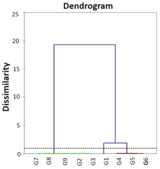 The automatic cut (dotted line) was placed on the dendrogram at a 0.954 distance, and it implied the formation of three clusters. In detail, the first cluster regrouped G1 and G5, whereas G2, G3, G7, G8, and G9 fell into the second cluster, and G4 and G6 fell into the third cluster. Noteworthily, from the HCA, it appeared that the samples were grouped into three different clusters (C1, C2, and C3) (Figure 3) in very good agreement with the results provided by the PCA.