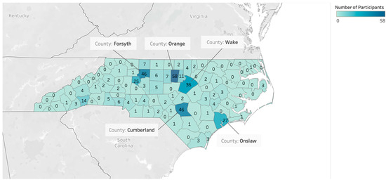 During the eligibility screening, 609 participants expressed interest in participating. Of these, 13 participants were ineligible, 159 eligible participants did not respond to any of the survey items (100% missing data) and were excluded, and 32 participants were excluded due to repeat enrollment. Consequently, complete survey data were obtained from 405 participants, and 221 of them completed the health assessment. Figure 1 shows the number of participants based on NC counties. In total, 56 counties participated in the Carolina Blue Project. The number of participants varies from 1 to 58 across different countries. The top five participating counties were Orange, Forsyth, Cumberland, Wake, and Onslow, which are urban and suburban counties.