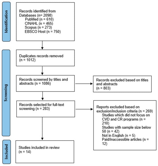 The main three databases were divided among three researchers who searched the electronic databases separately using key terms, and a total of 2098 studies were found. Then, 1012 duplicates were removed. After that, articles were filtered according to titles and abstracts, and 803 were excluded. The final 14 articles were selected after excluding 269 articles by reading the full text. Fourteen studies were included in the scoping review. The characteristics of the included studies are summarized in Table 1. One study was a systematic review [], four studies were prospective cohort studies [,,,], three studies were retrospective cohort studies [,,], four studies were cross-sectional studies [,,,], and one study was a qualitative study []. Two globally conducted studies were analyzed in the scoping review. Other studies were from the United States, Canada, Iran, Netherland, Sweden, and Spain. Most of the participants were either patients diagnosed with CVD or CR providers, including cardiologists, physicians, and CR managers. Findings of included studies are illustrated in Table 2.