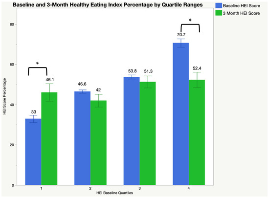 Healthy Eating Index scores from baseline and 3 months by quartiles. Healthy Eating Index (HEI) scores change from baseline and 3 months among quartile groups determined by baseline HEI scores (Q1 (low HEI): 23.26–40.68; Q2: 40.69–49.88; Q3: 49.89–59.89; Q4 (high HEI): 59.90–84.48). * Significant difference between baseline and 3-month HEI scores by quartile group; p < 0.05.