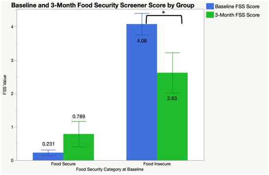 Food security scores from baseline and 3 months for at-risk group (low and very low food security status). Six-item food security screener (FSS) scores among an at-risk group (those with low/very low food security at baseline) at baseline and 3 months. * Significant difference between baseline and 3 month FSS scores by group; p < 0.05.