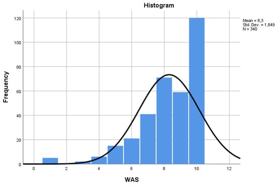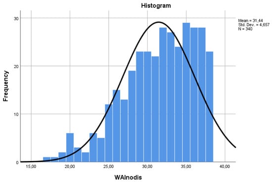 The average score of the WAI questionnaire was equal to 37.0 ± 5.6 points; median value 38. The distribution of scores was significantly non-normal (Kolmogorov–Smirnov test 0.105, p < 0.001; Shapiro–Wilk test 0.951, p < 0.001) (Figure 1). The reliability coefficient (Cronbach’s α) of the questionnaire was 0.73.