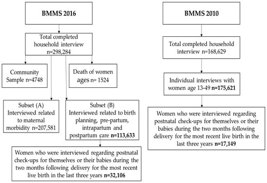 Since the primary outcome of interest of our study was PNC and its components for the most recent live births, we limited the sample to women who were asked if they received postnatal checkups for themselves or their babies during the two months following delivery for the most recent live births in the three years before the BMMS 2016 survey. For comparisons and descriptive analysis, we have used BMMS 2010, and for determinants analysis, we have used BMMS 2016. We have applied similar selection criteria for the BMMS 2010 survey data as of BMMS 2016. The total sample size for BMMS 2010 was 17,149 and for BMMS 2016 was 32,106 mothers (Figure 1).