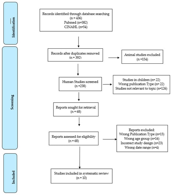 A total of 436 articles were found within the search parameters and imported into Rayyan. Duplicates, which totaled 44, were removed using the duplicate identification function. After reviewing full texts, 10 articles met the inclusion criteria and were included in the current systematic review (Figure 1).